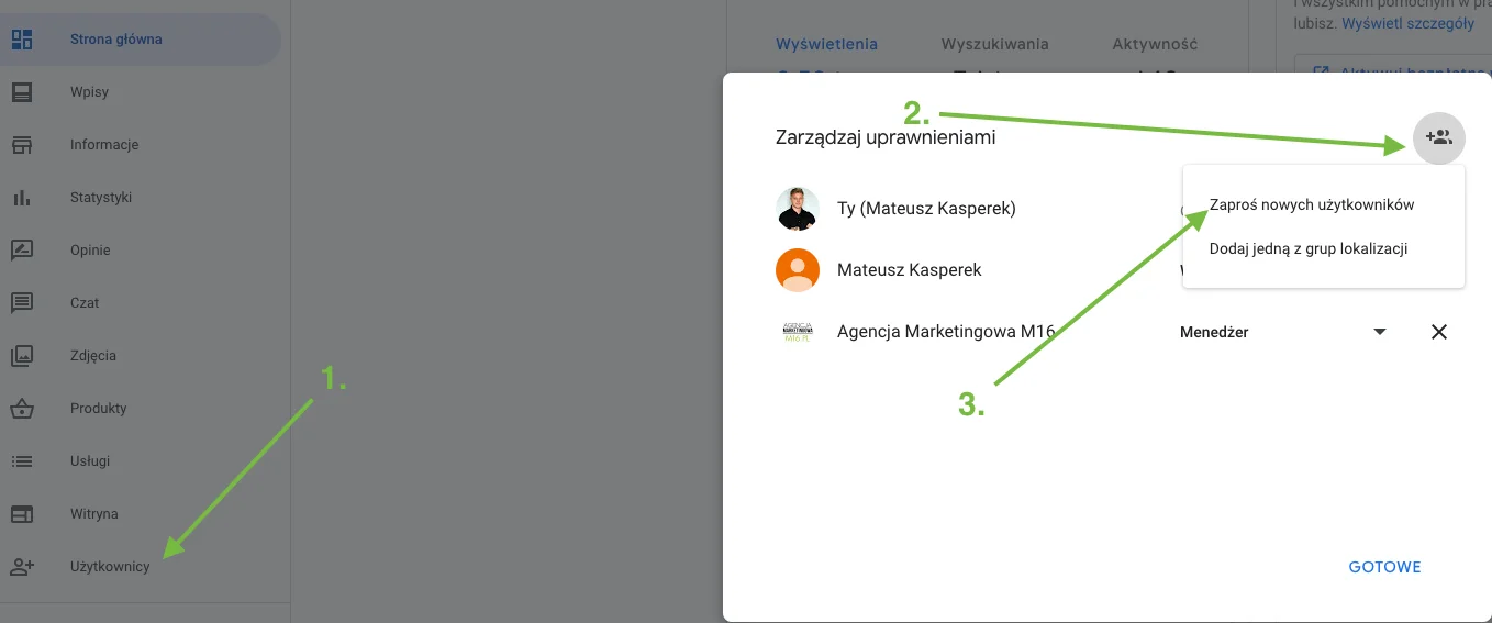 V pravém horním rohu klikneme na ikonu plusu a poté vybereme možnost "Pozvat nové uživatele". Zadáme e-mailovou adresu účtu, který chceme pozvat (v našem případě to je agencjamarketingowam16@gmail.com), vybereme oprávnění: manažer a poté klikneme na "Pozvat".