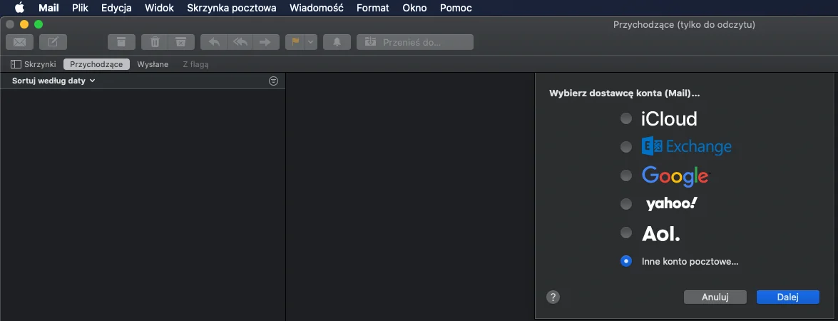 3. Pokud jsme zvolili možnost "Jiný poštovní účet", budeme vyzváni k zadání serveru příchozí a odchozí pošty, tedy mail.nazvatvojedomeny.pl; poté znovu klikneme na "Přihlásit se".